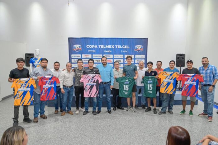 Monclova, Coahuila, 25 de septiembre de 2025.- Con el objetivo de seguir impulsando el deporte en Monclova, el alcalde Carlos Villarreal y el director general del Instituto Estatal del Deporte de Coahuila (INEDEC), acompañaron a Juan Elizalde, presidente de la Asociación Estatal de Fútbol en la presentación de los uniformes de la edición estatal 2025 de la Copa Telmex.