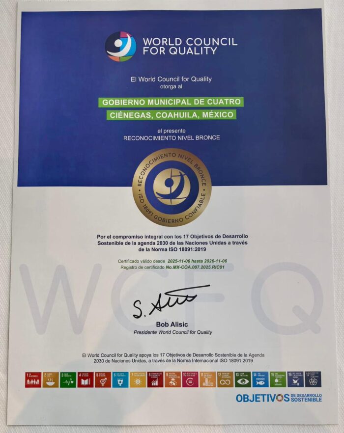Cuatro Ciénegas, Coahuila a 09 de noviembre del 2025. – El Gobierno Municipal de Cuatro Ciénegas, encabezado por el Ing. Víctor Manuel Leija Vega, fue distinguido con el reconocimiento Nivel Bronce como Gobierno Confiable, durante el Congreso Internacional Smart City, celebrado en Barcelona, España.
