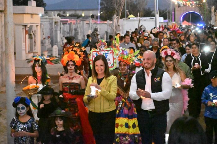 Frontera, Coahuila; a 1 de noviembre de 2025.- Para celebrar las tradiciones de los Fieles Difuntos, la alcaldesa Sari Pérez Cantú, a través de la Dirección de Arte y Cultura del Ayuntamiento de Frontera, realizó la Alumbrada 2025 en el Panteón Dolores de la colonia Occidental. Las festividades se llevaron a cabo en un ambiente lleno de luz, color y seguridad.