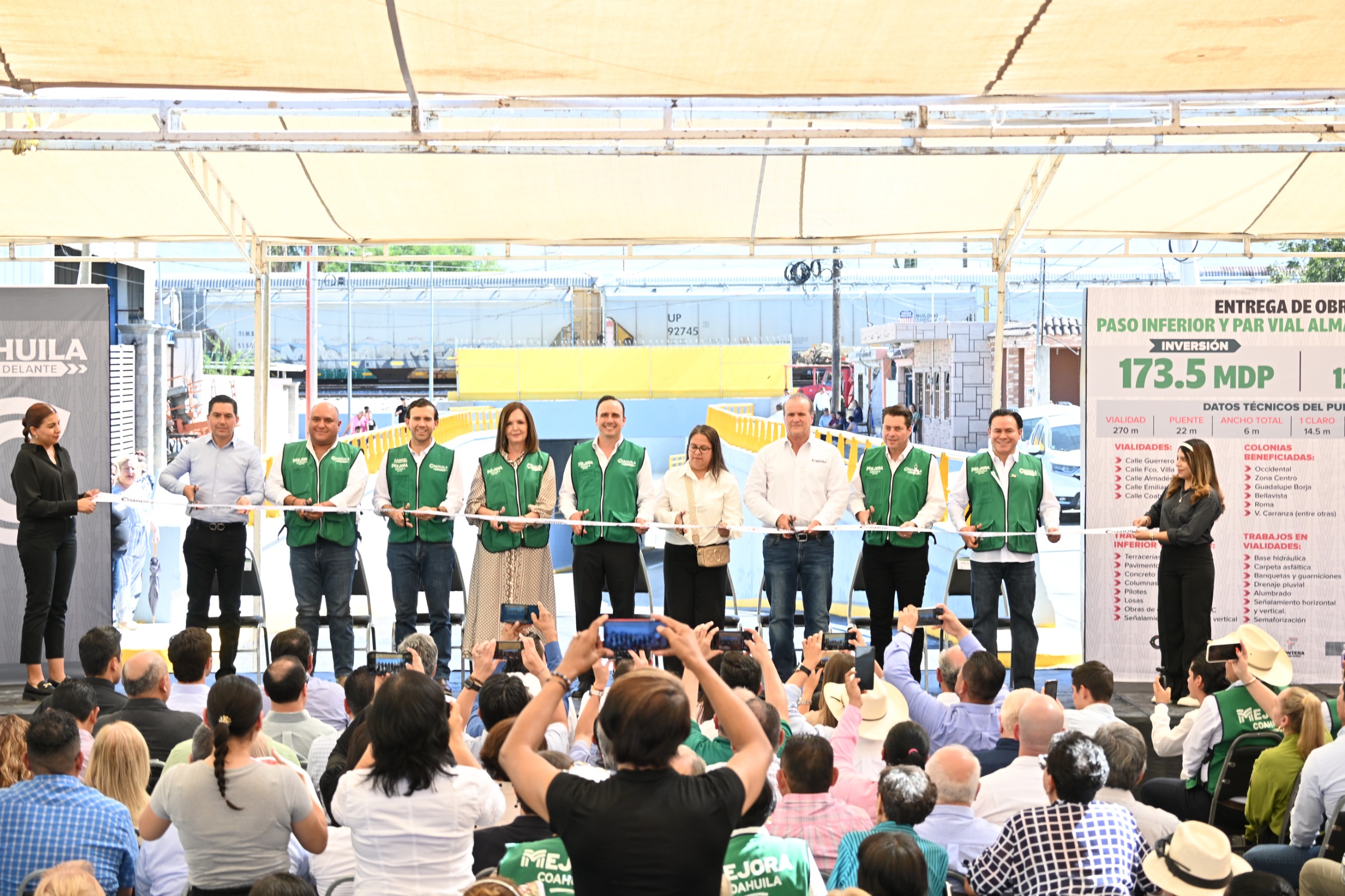 Frontera, Coahuila; a 28 de octubre de 2025.– Para continuar reforzando la competitividad de Frontera y la Región Centro, el gobernador Manolo Jiménez Salinas y la alcaldesa Sari Pérez Cantú inauguraron el Paso Inferior y Par Vial Almadén–Coahuila. Esta obra emblemática marca un precedente para la movilidad y desarrollo urbano de la ciudad y cuenta con una inversión superior a los 173 millones de pesos que beneficiará, con infraestructura moderna y segura, a miles de automovilistas, trabajadores y familias que transitan diariamente por este punto estratégico de la ciudad.