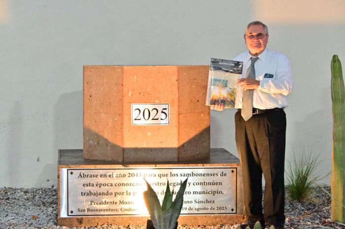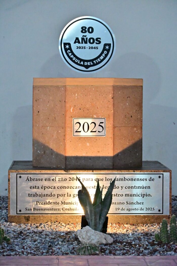 San Buenaventura, Coahuila; 09 de septiembre de 2025.- En el marco de la edición número 80 de la tradicional Feria del 14 de Julio, el Ayuntamiento de San Buenaventura hizo historia al sellar una cápsula del tiempo que será abierta dentro de 20 años, durante el centenario de la máxima fiesta de los sambonenses.
