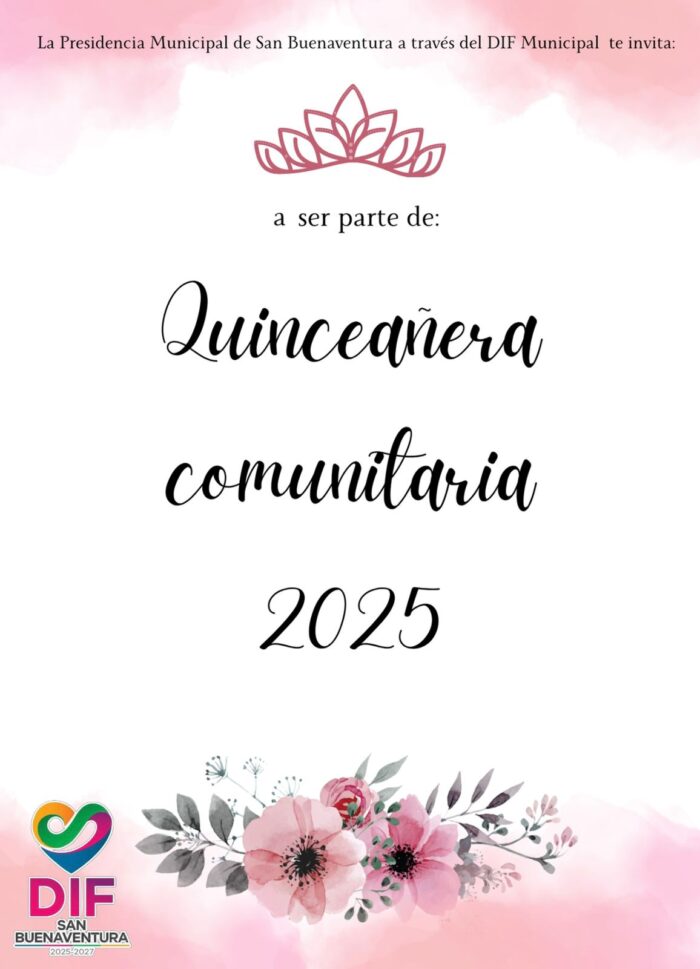 San Buenaventura, Coahuila; 15 octubre de 2025.- El Gobierno Municipal de San Buenaventura invita a todas las jóvenes sambonenses a participar en la Quinceañera Comunitaria 2025, un evento lleno de magia, ilusión y alegría donde celebraremos juntos este momento tan especial.
