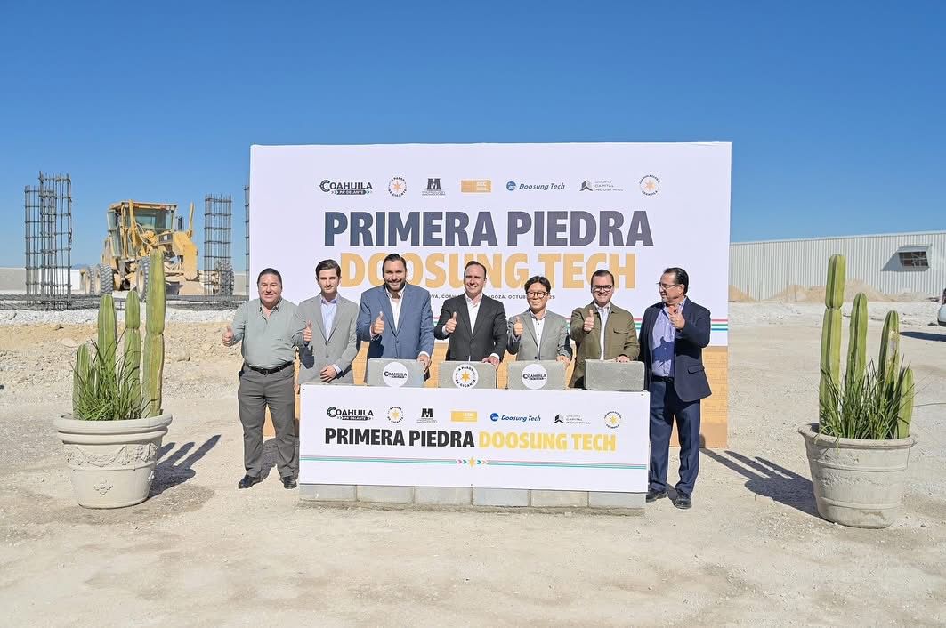 Monclova, Coahuila, 28 de octubre de 2025.- Con el objetivo de fortalecer el desarrollo económico y continuar apoyando la generación de empleos para las familias de la Región Centro, el Gobernador Manolo Jiménez Salinas, en equipo con el alcalde Carlos Villarreal, encabezaron la colocación de la primera piedra de Doosung Tech, empresa coreana especializada en la producción de componentes para vehículos eléctricos, que llega a Monclova con un proyecto de inversión de casi 500 millones de pesos y que iniciará operaciones en el primer semestre de 2026.