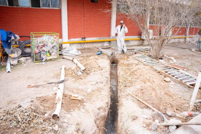 Asimismo, en el CECyTEC Andrés Osuna, el departamento de SIMAS ejecuta labores de cambio de tubería de drenaje, la cual tenía más de 30 años de antigüedad y se encontraba en condiciones obsoletas, representando un riesgo sanitario para la comunidad escolar.